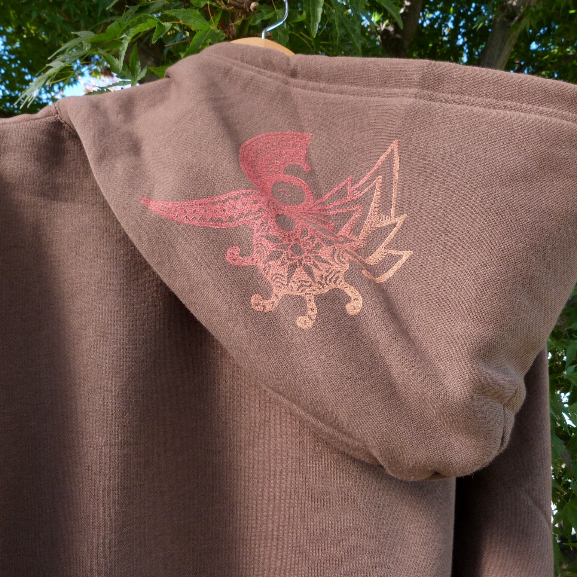 Block printed on 10.0 oz high quality pull over hoodie.